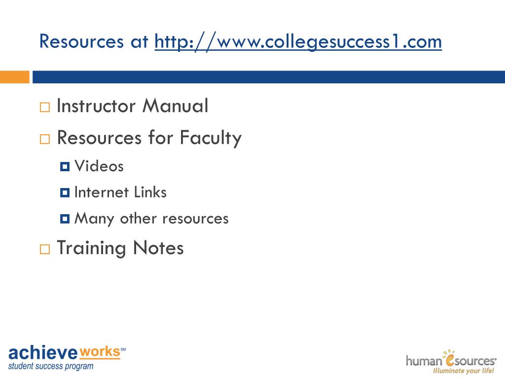 Resources at http://www.collegesuccess1.com • Instructor Manual • Resources for Faculty • Videos • Internet Links • Many other resources • Training Notes