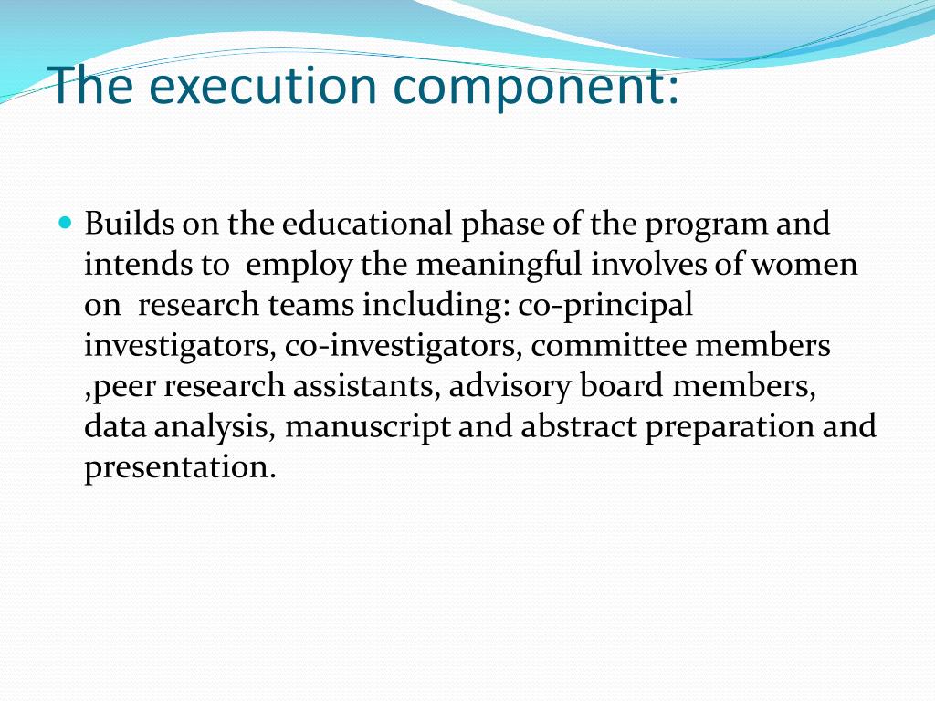 The execution component: • Builds on the educational phase of the program and intends to employ the meaningful involves of women on research teams including: co-principal investigators, co-investigators, committee members ,peer research assistants, advisory board members, data analysis, manuscript and abstract preparation and presentation.