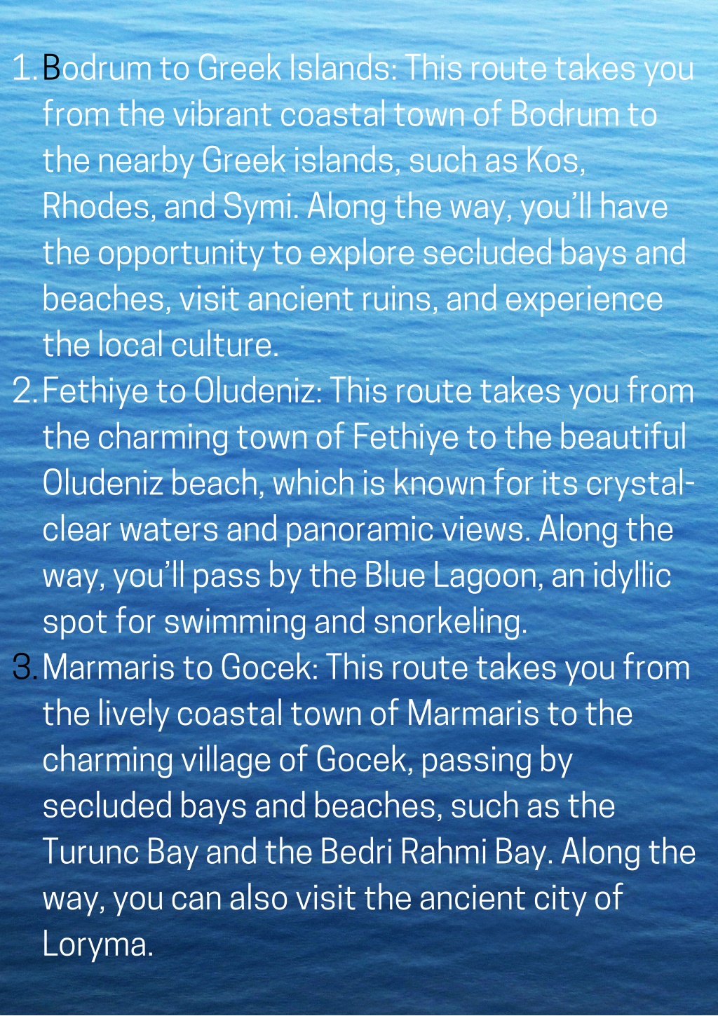 1. Bodrum to Greek Islands: Ths route takes you from the vbrant coastal town of Bodrum to the nearby Greek slands, such as Kos, Rhodes, and Sym. Along the way, you’ll have the opportunty to explore secluded bays and beaches, vst ancent runs, and experence the local culture. Fethye to Oludenz: Ths route takes you from the charmng town of Fethye to the beautful Oludenz beach, whch s known for ts crystal- clear waters and panoramc vews. Along the way, you’ll pass by the Blue Lagoon, an dyllc spot for swmmng and snorkelng. Marmars to Gocek: Ths route takes you from the lvely coastal town of Marmars to the charmng vllage of Gocek, passng by secluded bays and beaches, such as the Turunc Bay and the Bedr Rahm Bay. Along the way, you can also vst the ancent cty of Loryma. 2. 3.