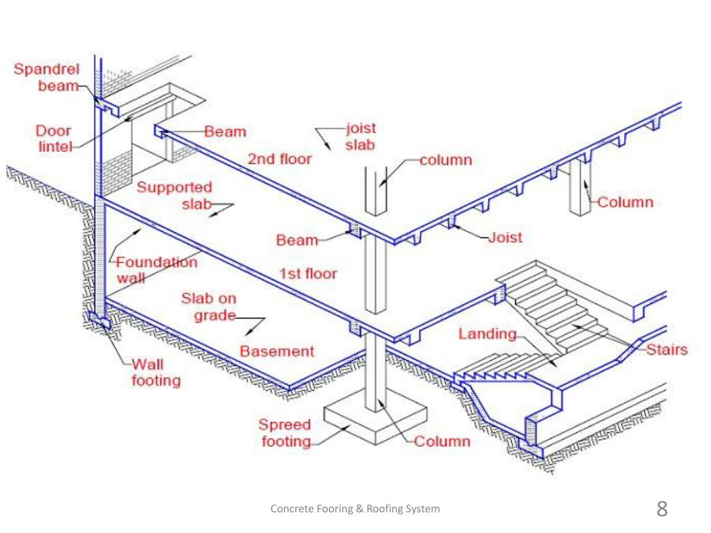 CONCRETE FLOORING & ROOFING SYSTEM. Reinforced concrete floor is called “ SLAB ”. Slab is generally constructed in two major types : slab on grade and slab on beam.
