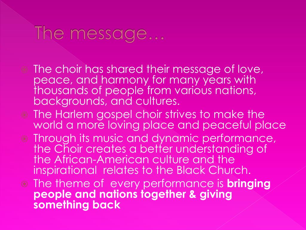 The message… • The choir has shared their message of love, peace, and harmony for many years with thousands of people from various nations, backgrounds, and cultures. • The Harlem gospel choir strives to make the world a more loving place and peaceful place • Through its music and dynamic performance, the Choir creates a better understanding of the African-American culture and the inspirational relates to the Black Church. • The theme of every performance is bringing people and nations together & giving something back