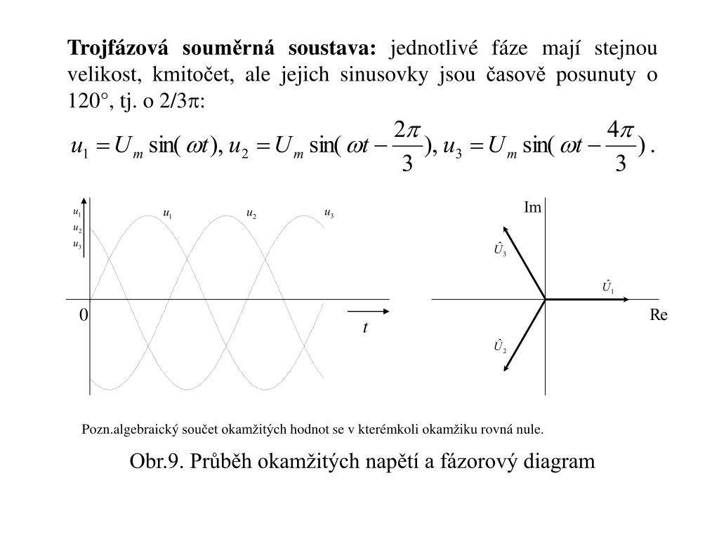 0 t Trojfázová souměrná soustava: jednotlivé fáze mají stejnou velikost, kmitočet, ale jejich sinusovky jsou časově posunuty o 120°, tj. o 2/3: Pozn.algebraický součet okamžitých hodnot se v kterémkoli okamžiku rovná nule. Obr.9. Průběh okamžitých napětí a fázorový diagram