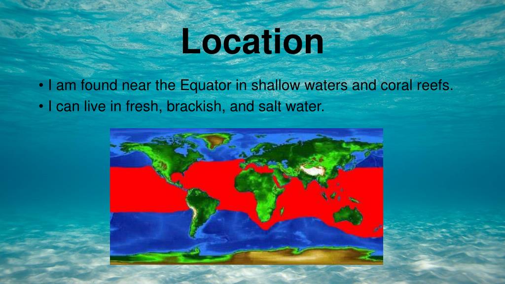 Location • I am found near the Equator in shallow waters and coral reefs. • I can live in fresh, brackish, and salt water.