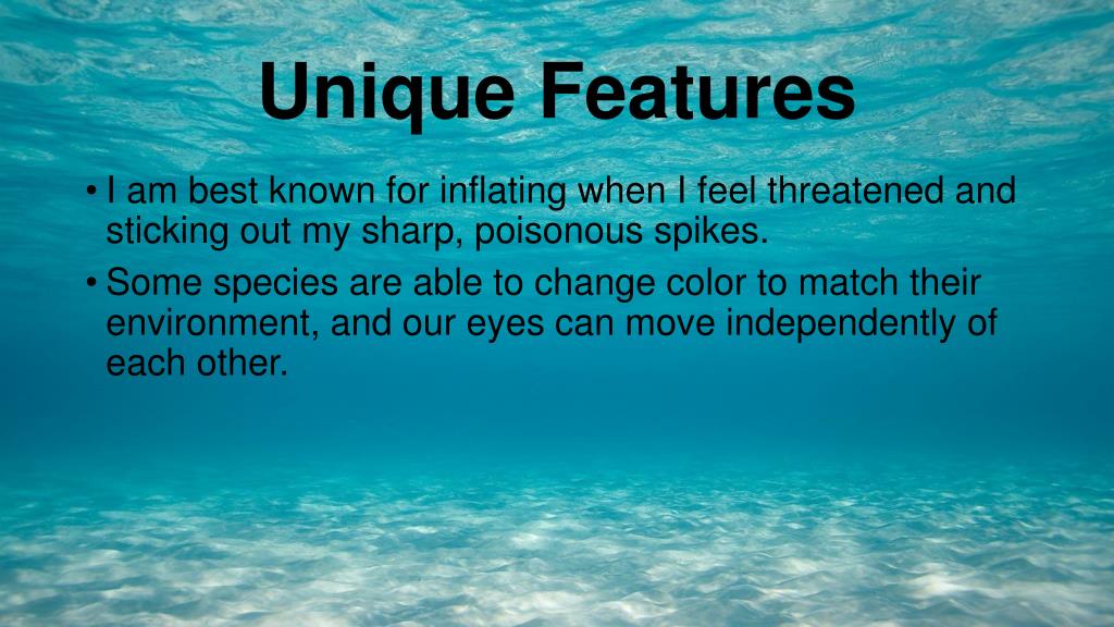Unique Features • I am best known for inflating when Ifeel threatened and sticking out my sharp, poisonous spikes. • Some species are able to change color to match their environment, and our eyes can move independently of each other.