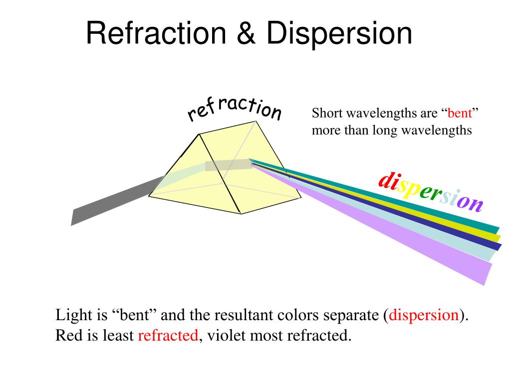 ref rac tion Refraction & Dispersion Short wavelengths are “bent” more than long wavelengths dispersion Light is “bent” and the resultant colors separate (dispersion). Red is least refracted, violet most refracted.