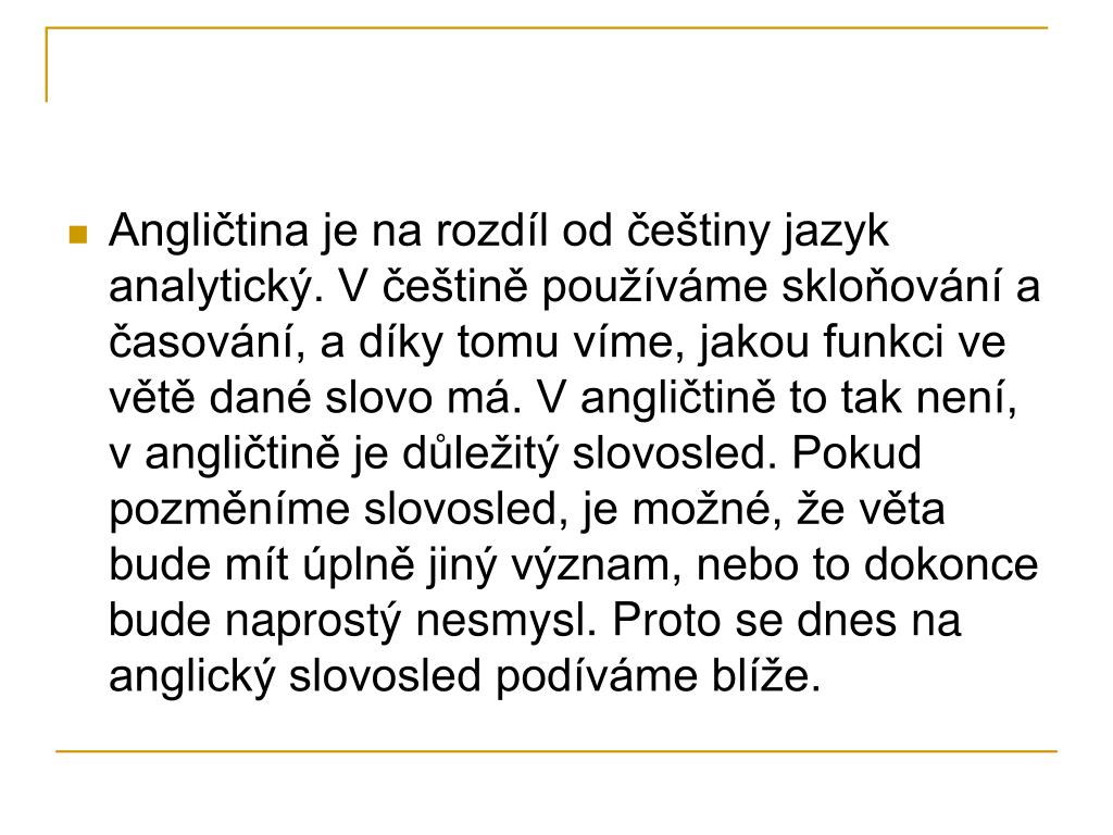Angličtina je na rozdíl od češtiny jazyk analytický. V češtině používáme skloňování a časování, a díky tomu víme, jakou funkci ve větě dané slovo má. V angličtině to tak není, v angličtině je důležitý slovosled. Pokud pozměníme slovosled, je možné, že věta bude mít úplně jiný význam, nebo to dokonce bude naprostý nesmysl. Proto se dnes na anglický slovosled podíváme blíže.