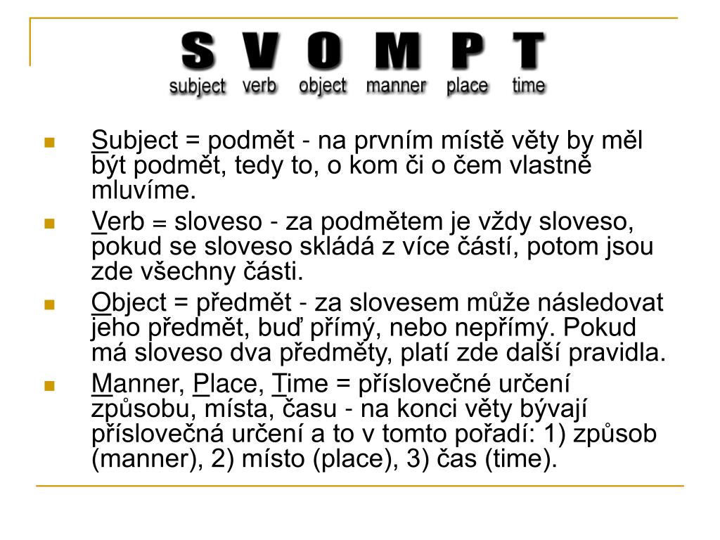 Subject = podmět - na prvním místě věty by měl být podmět, tedy to, o kom či o čem vlastně mluvíme. • Verb = sloveso - za podmětem je vždy sloveso, pokud se sloveso skládá z více částí, potom jsou zde všechny části. • Object = předmět - za slovesem může následovat jeho předmět, buď přímý, nebo nepřímý. Pokud má sloveso dva předměty, platí zde další pravidla. • Manner, Place, Time = příslovečné určení způsobu, místa, času - na konci věty bývají příslovečná určení a to v tomto pořadí: 1) způsob (manner), 2) místo (place), 3) čas (time).