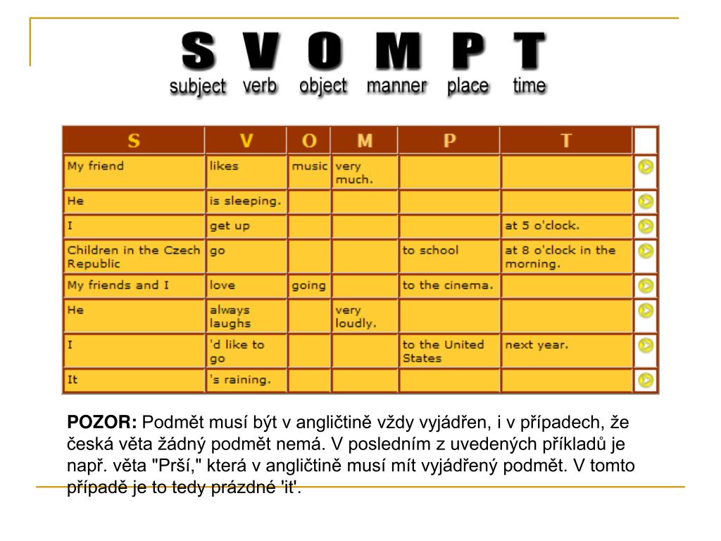 SVOMPT • Hlavní pravidlo pro anglický slovosled oznamovací věty se dá shrnout těmito šesti písmeny. Používám je proto, že se tato zkratka dobře pamatuje. Zásadní ale je, abyste věděli, co které písmenko znamená. Jsou to počáteční písmena větných členů.