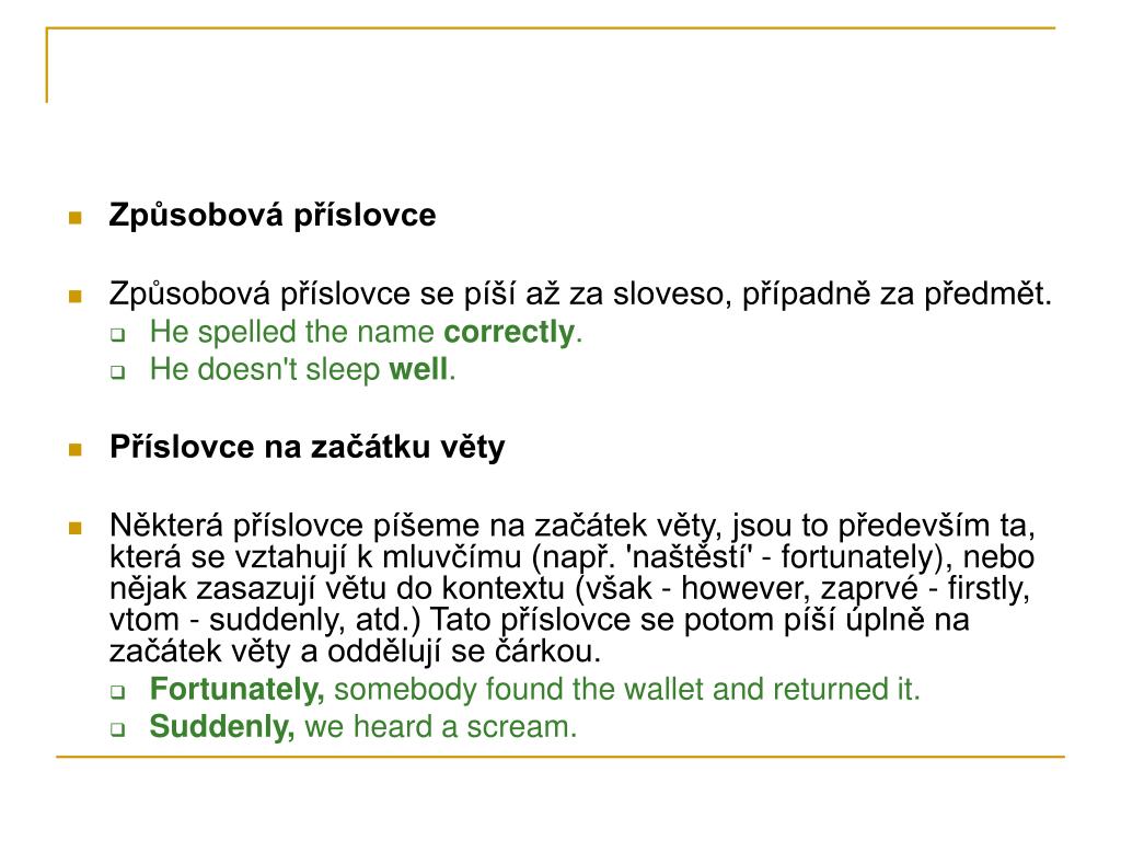 Způsobová příslovce • Způsobová příslovce se píší až za sloveso, případně za předmět. • He spelled the name correctly. • He doesn't sleep well. • Příslovce na začátku věty • Některá příslovce píšeme na začátek věty, jsou to především ta, která se vztahují k mluvčímu (např. 'naštěstí' - fortunately), nebo nějak zasazují větu do kontextu (však - however, zaprvé - firstly, vtom - suddenly, atd.) Tato příslovce se potom píší úplně na začátek věty a oddělují se čárkou. • Fortunately, somebody found the wallet and returned it. • Suddenly, we heard a scream.
