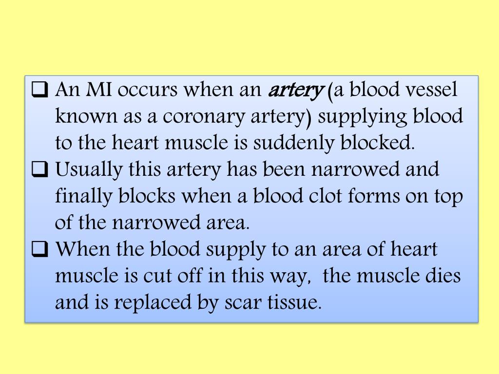 An MI occurs when an artery (a blood vessel known as a coronary artery) supplying blood to the heart muscle is suddenly blocked. • Usually this artery has been narrowed and finally blocks when a blood clot forms on top of the narrowed area. • When the blood supply to an area of heart muscle is cut off in this way, the muscle dies and is replaced by scar tissue.