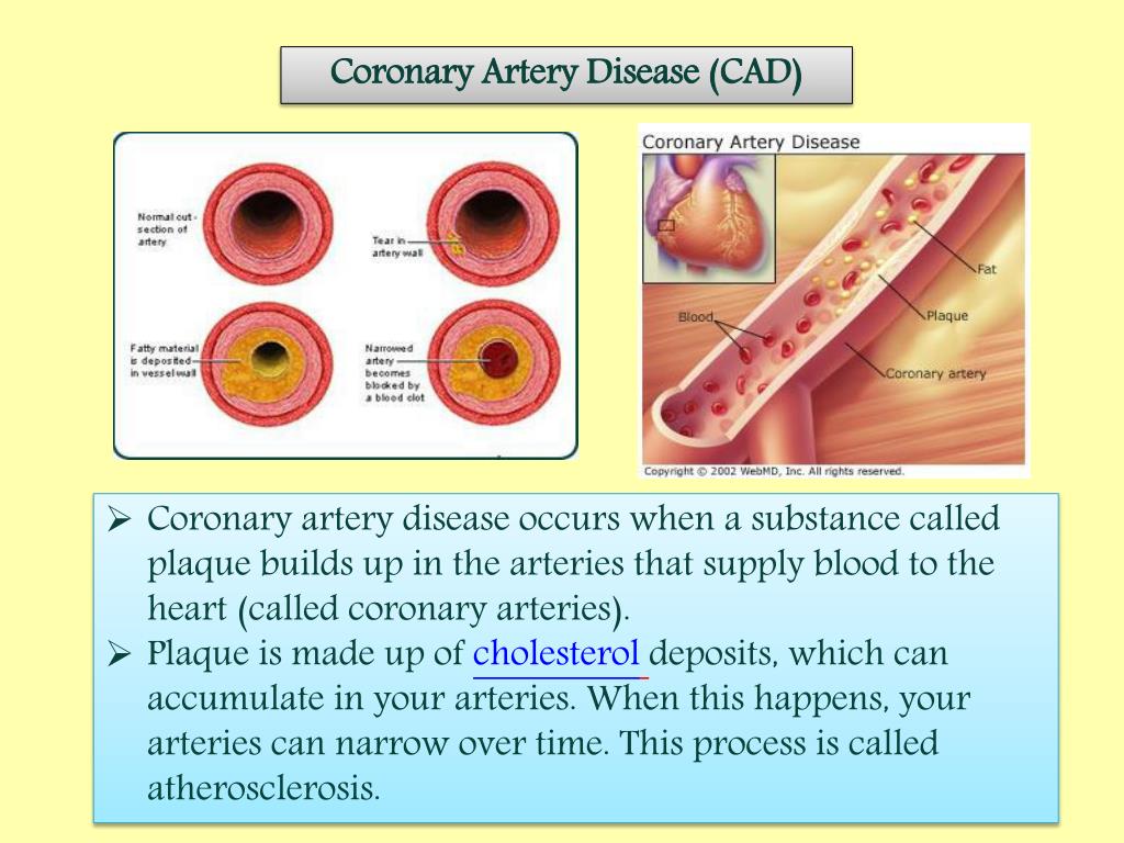 Coronary Artery Disease (CAD) • Coronary artery disease occurs when a substance called plaque builds up in the arteries that supply blood to the heart (called coronary arteries). • Plaque is made up of cholesteroldeposits, which can accumulate in your arteries. When this happens, your arteries can narrow over time. This process is called atherosclerosis.