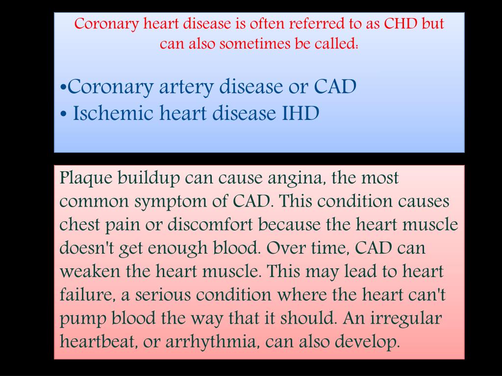 Coronary heart disease is often referred to as CHD but can also sometimes be called: • Coronary artery disease or CAD • Ischemic heart disease IHD Plaque buildup can cause angina, the most common symptom of CAD. This condition causes chest pain or discomfort because the heart muscle doesn't get enough blood. Over time, CAD can weaken the heart muscle. This may lead to heart failure, a serious condition where the heart can't pump blood the way that it should. An irregular heartbeat, or arrhythmia, can also develop.