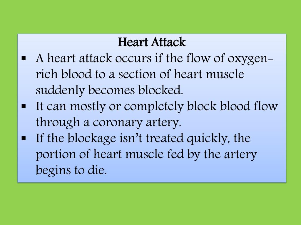 Heart Attack • A heart attack occurs if the flow of oxygen-rich blood to a section of heart muscle suddenly becomes blocked. • It can mostly or completely block blood flow through a coronary artery. • If the blockage isn’t treated quickly, the portion of heart muscle fed by the artery begins to die.