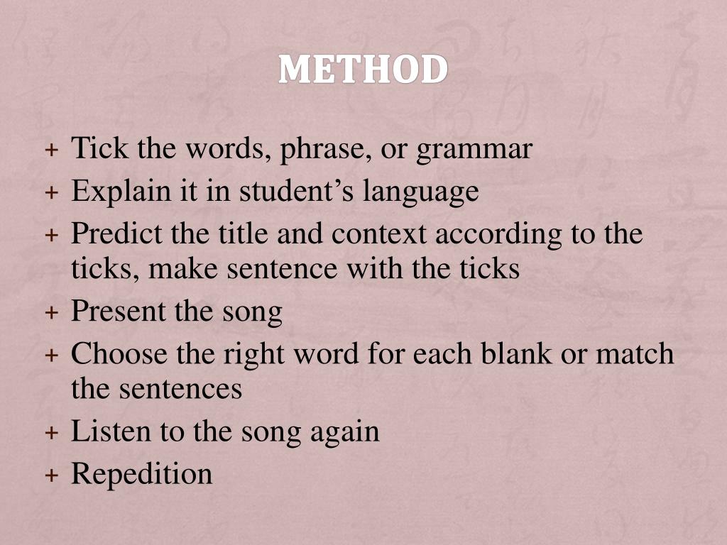 Method • Tick the words, phrase, or grammar • Explain it in student’s language • Predict the title and context according to the ticks, make sentence with the ticks • Present the song • Choose the right word for each blank or match the sentences • Listen to the song again • Repedition