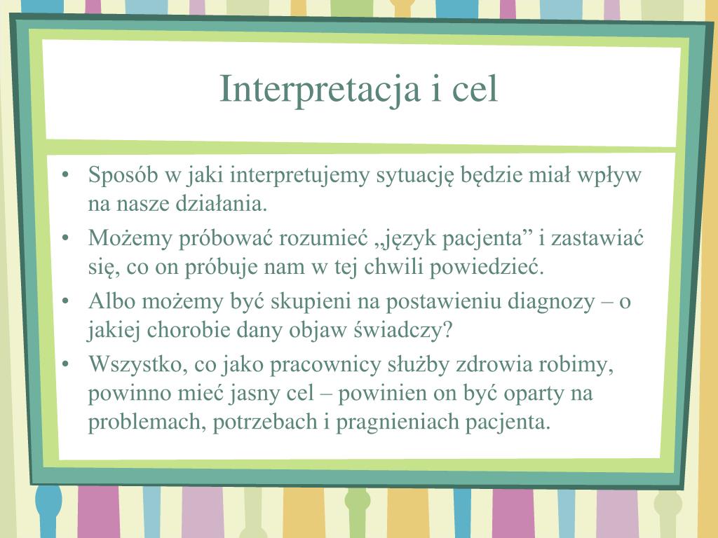 Interpretacja i cel • Sposób w jaki interpretujemy sytuację będzie miał wpływ na nasze działania. • Możemy próbować rozumieć „język pacjenta” i zastawiać się, co on próbuje nam w tej chwili powiedzieć. • Albo możemy być skupieni na postawieniu diagnozy – o jakiej chorobie dany objaw świadczy? • Wszystko, co jako pracownicy służby zdrowia robimy, powinno mieć jasny cel – powinien on być oparty na problemach, potrzebach i pragnieniach pacjenta.