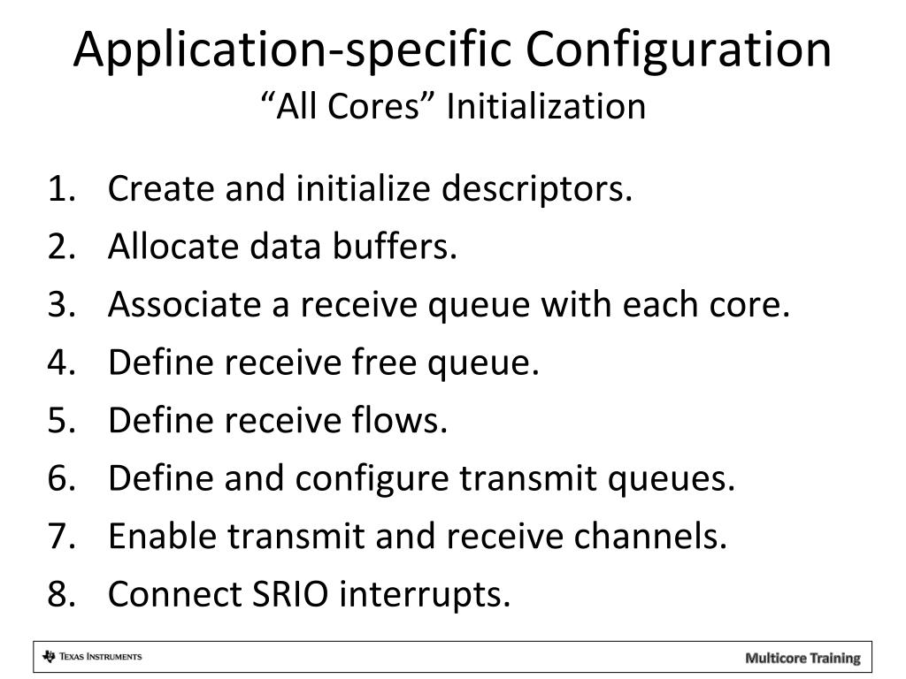 Application-specific Configuration “All Cores” Initialization Create and initialize descriptors. Allocate data buffers. Associate a receive queue with each core. Define receive free queue. Define receive flows. Define and configure transmit queues. Enable transmit and receive channels. Connect SRIO interrupts.