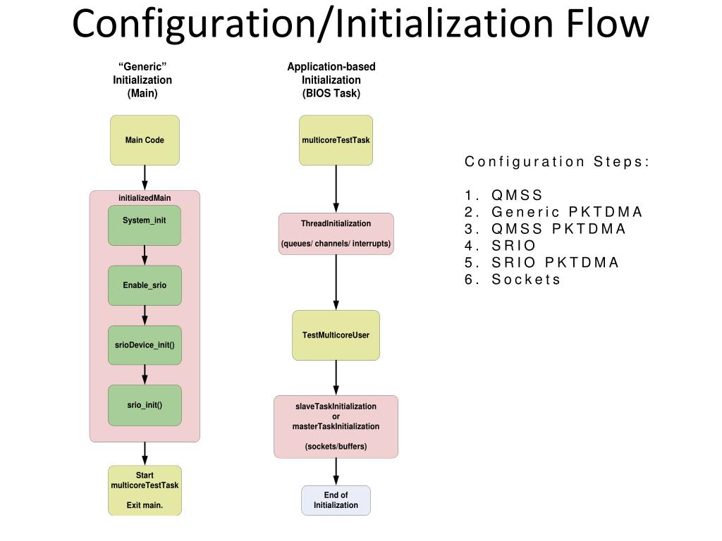 Configuration/Initialization Flow Configuration Steps: QMSS Generic PKTDMA QMSS PKTDMA SRIO SRIO PKTDMA Sockets