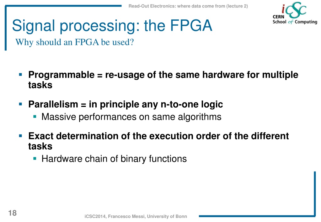 Read-Out Electronics: where data come from Lecture 2 Francesco Messi Rheinische Friedrich- Wilhelms - Universität Bonn – DE Inverted CERN School of Computing, 24-25 February 2014. Outlook. Prologue The magic key: Electronics The FPGA (Field Programmable Gate Array)