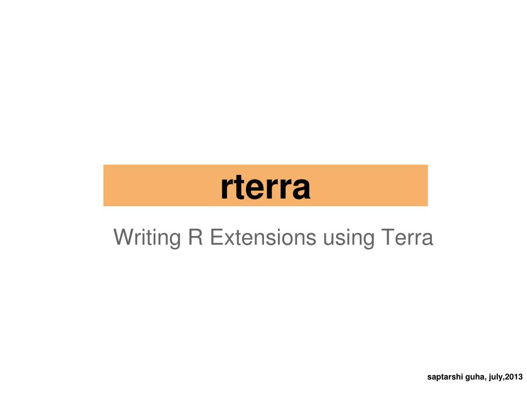 rterra. Writing R Extensions using Terra. saptarshi guha, july,2013. The Case for R Extensions. Take advantage of libraries written in other languages e.g. C,C++, and Fortran Performance of algorithms written in R is not often the speediest, especially for scalar manipulations