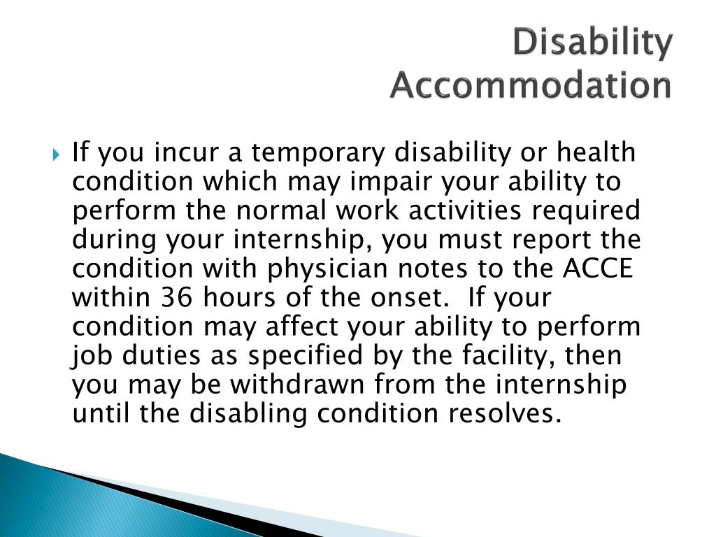 DisabilityAccommodation • If you incur a temporary disability or health condition which may impair your ability to perform the normal work activities required during your internship, you must report the condition with physician notes to the ACCE within 36 hours of the onset. If your condition may affect your ability to perform job duties as specified by the facility, then you may be withdrawn from the internship until the disabling condition resolves.