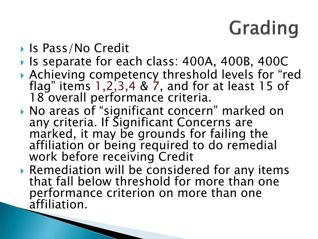 Grading • Is Pass/No Credit • Is separate for each class: 400A, 400B, 400C • Achieving competency threshold levels for “red flag” items 1,2,3,4 & 7, and for at least 15 of 18 overall performance criteria. • No areas of “significant concern” marked on any criteria. If Significant Concerns are marked, it may be grounds for failing the affiliation or being required to do remedial work before receiving Credit • Remediation will be considered for any items that fall below threshold for more than one performance criterion on more than one affiliation.