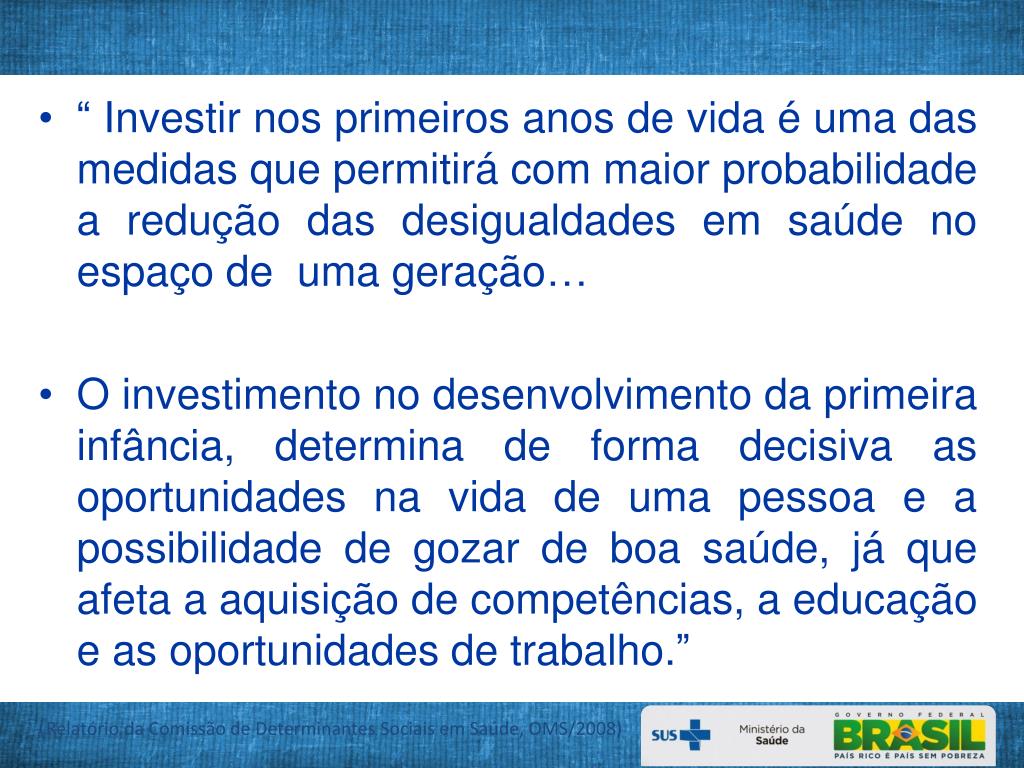 “ Investir nos primeiros anos de vida é uma das medidas que permitirá com maior probabilidade a redução das desigualdades em saúde no espaço de uma geração… • O investimento no desenvolvimento da primeira infância, determina de forma decisiva as oportunidades na vida de uma pessoa e a possibilidade de gozar de boa saúde, já que afeta a aquisição de competências, a educação e as oportunidades de trabalho.” (Relatório da Comissão de Determinantes Sociais em Saúde, OMS/2008)