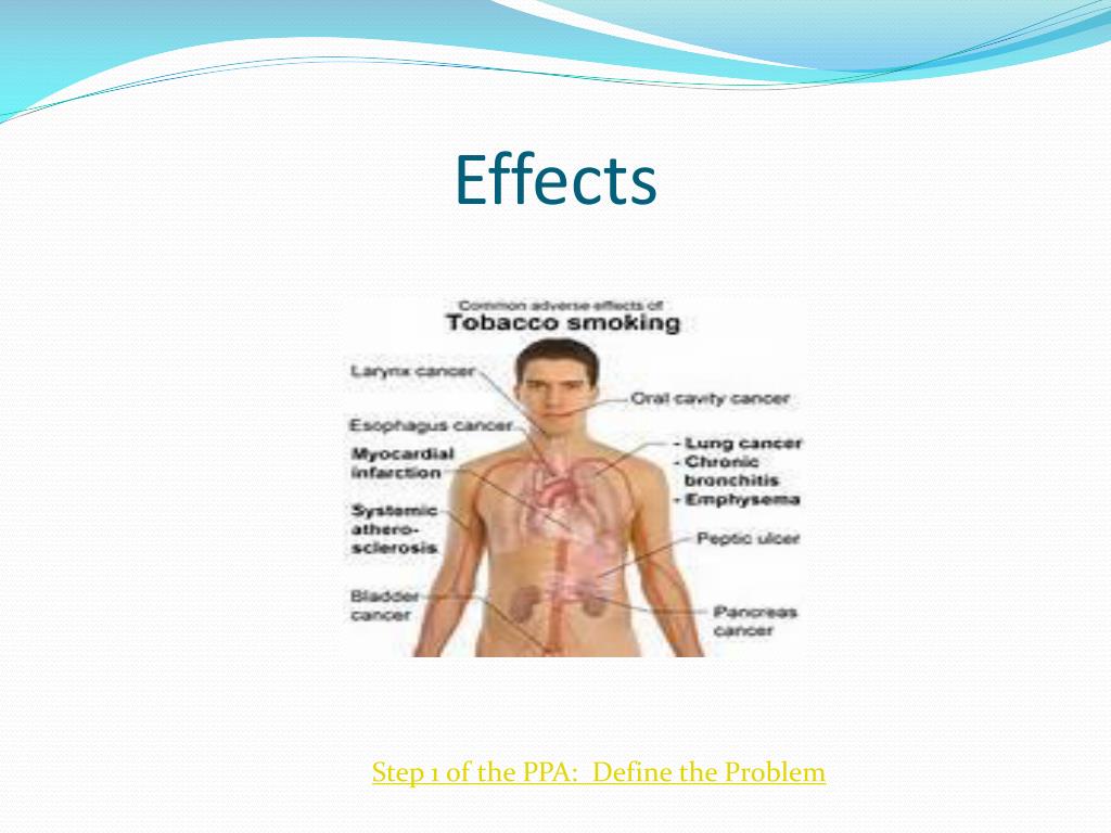 Effects of Teen Smoking • Shortness of breath • Poor lung function • Respiratory problems • Heart problems • Addiction • Oral health problems • Cancer Step 1 of the PPA: Define the Problem
