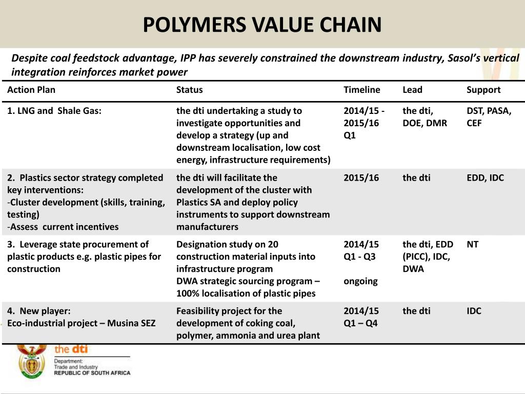Mineral value chain study • DTI initiated Mineral Value Chain Study in Jan 2013 to develop key interventions to advance beneficiation in SA. • Project steering committee - the dti, DMR, DST, IDC, TNPA • Develop strategies and proposals to advance Upstream (Mining and transport and capital equipment) and forward beneficiation across 5 priority value chains: • iron-ore and steel • polymers • titanium • platinum group metals • Upstream mining inputs • (Work also underway on Oil and Gas)
