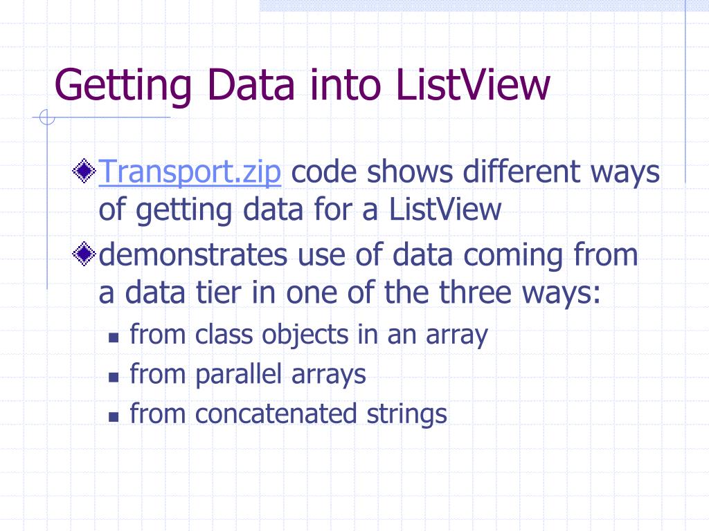Getting Data into ListView • Transport.zip code shows different ways of getting data for a ListView • demonstrates use of data coming from a data tier in one of the three ways: • from class objects in an array • from parallel arrays • from concatenated strings