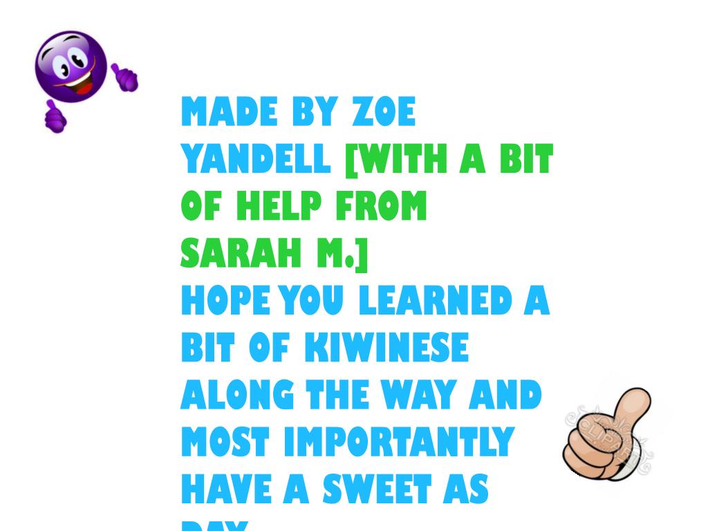 MADE BY ZOE YANDELL [WITH A BIT OF HELP FROM SARAH M.] HOPE YOU LEARNED A BIT OF KIWINESE ALONG THE WAY AND MOST IMPORTANTLY HAVE A SWEET AS DAY. MINTAGE AS