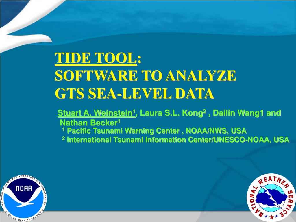 TIDE TOOL: SOFTWARE TO ANALYZE GTS SEA-LEVEL DATA Stuart A. Weinstein1, Laura S.L. Kong2 , DailinWang1 and Nathan Becker1 1 Pacific Tsunami Warning Center , NOAA/NWS, USA 2 International Tsunami Information Center/UNESCO-NOAA, USA