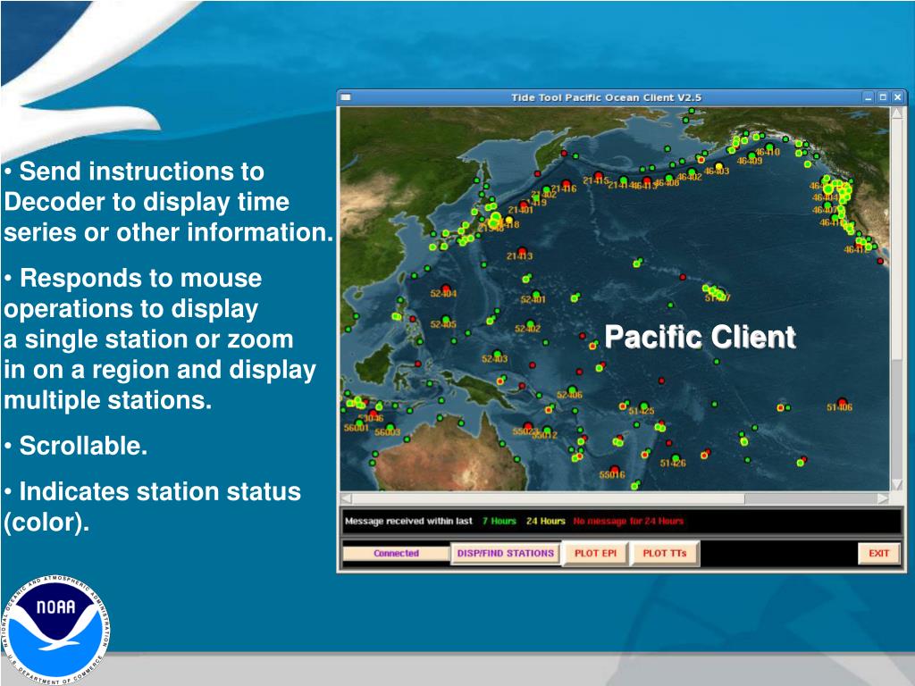 Send instructions to Decoder to display time series or other information. • Responds to mouse operations to display a single station or zoom in on a region and display multiple stations. • Scrollable. • Indicates station status (color). Pacific Client