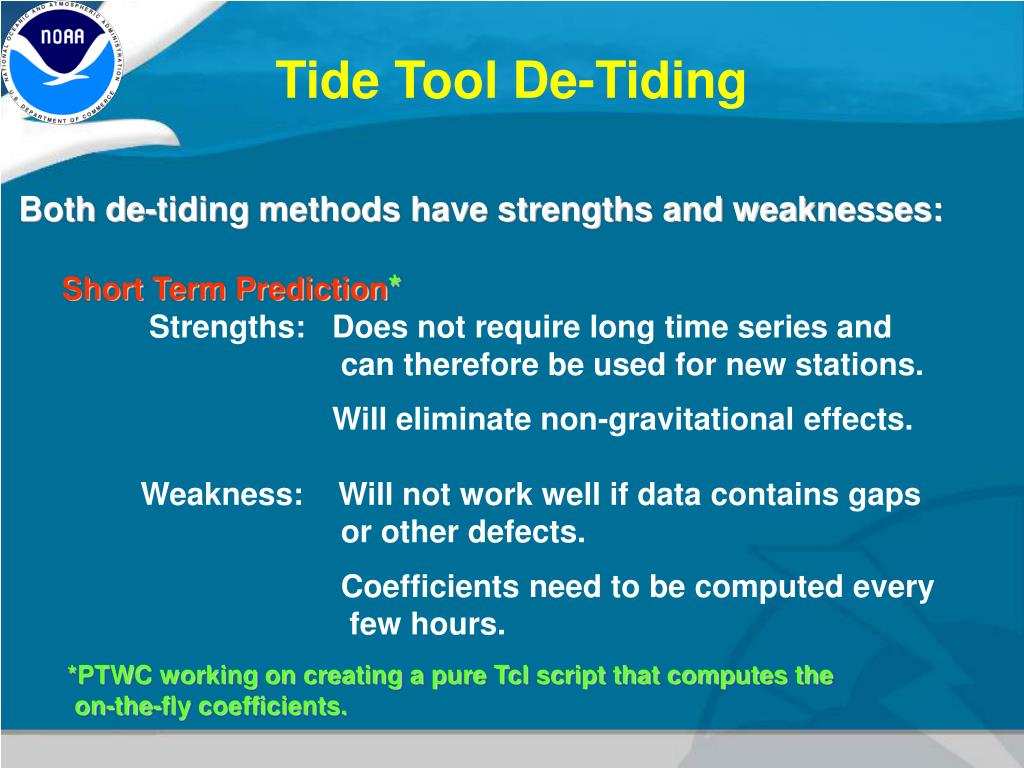Tide Tool De-Tiding Both de-tiding methods have strengths and weaknesses: Short Term Prediction* Strengths: Does not require long time series and can therefore be used for new stations. Will eliminate non-gravitational effects. Weakness: Will not work well if data contains gaps or other defects. Coefficients need to be computed every few hours. *PTWC working on creating a pure Tcl script that computes the on-the-fly coefficients.