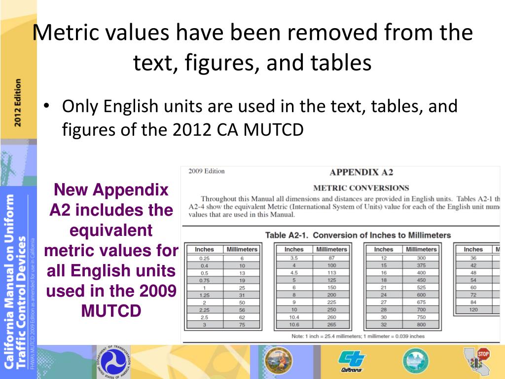 Metric values have been removed from the text, figures, and tables • Only English units are used in the text, tables, and figures of the 2012 CA MUTCD New Appendix A2 includes the equivalent metric values for all English units used in the 2009 MUTCD