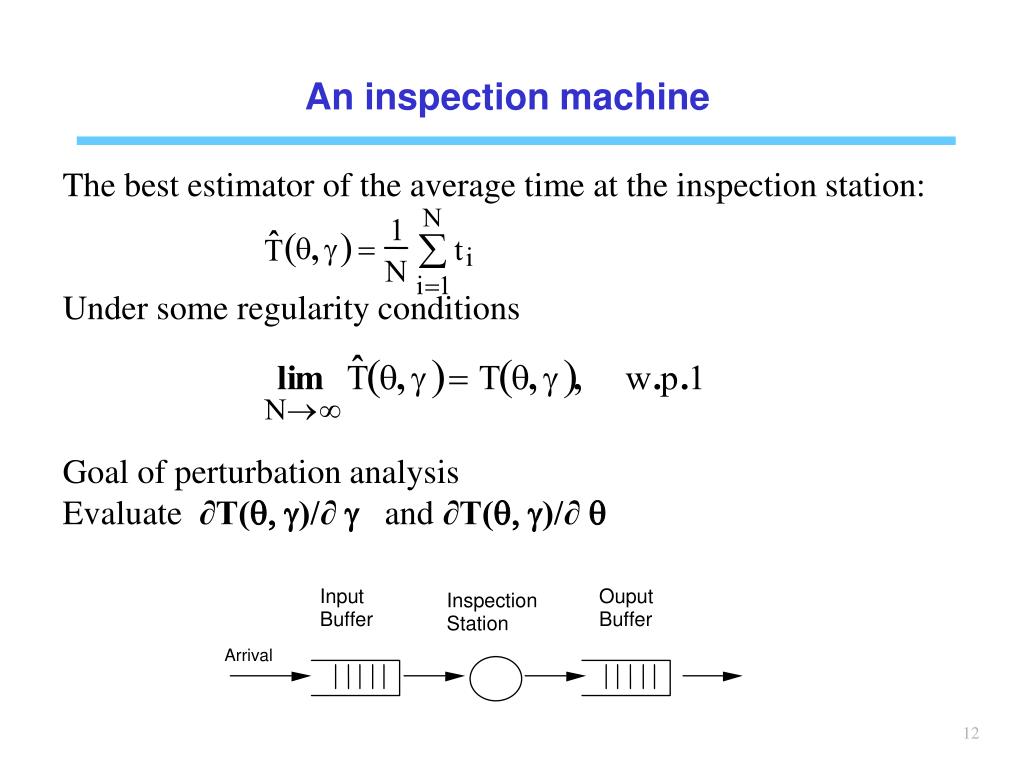 An inspection machine The best estimator of the average time at the inspection station: Under some regularity conditions Goal of perturbation analysis Evaluate ∂T(q, g)/∂ g and ∂T(q, g)/∂ q