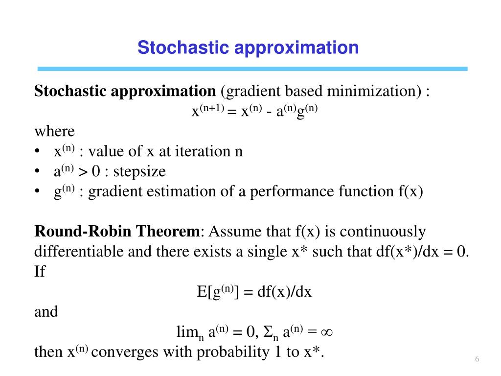 Stochastic approximation • Stochastic approximation (gradient basedminimization) : • x(n+1) = x(n) - a(n)g(n) • where • x(n) : value of x atiteration n • a(n) > 0 : stepsize • g(n) : gradient estimation of a performance function f(x) • Round-Robin Theorem: Assume that f(x) iscontinuouslydifferentiable and thereexists a single x* suchthatdf(x*)/dx = 0. If • E[g(n)] = df(x)/dx • and • limn a(n)= 0, Sn a(n) = ∞ • thenx(n) converges withprobability 1 to x*.