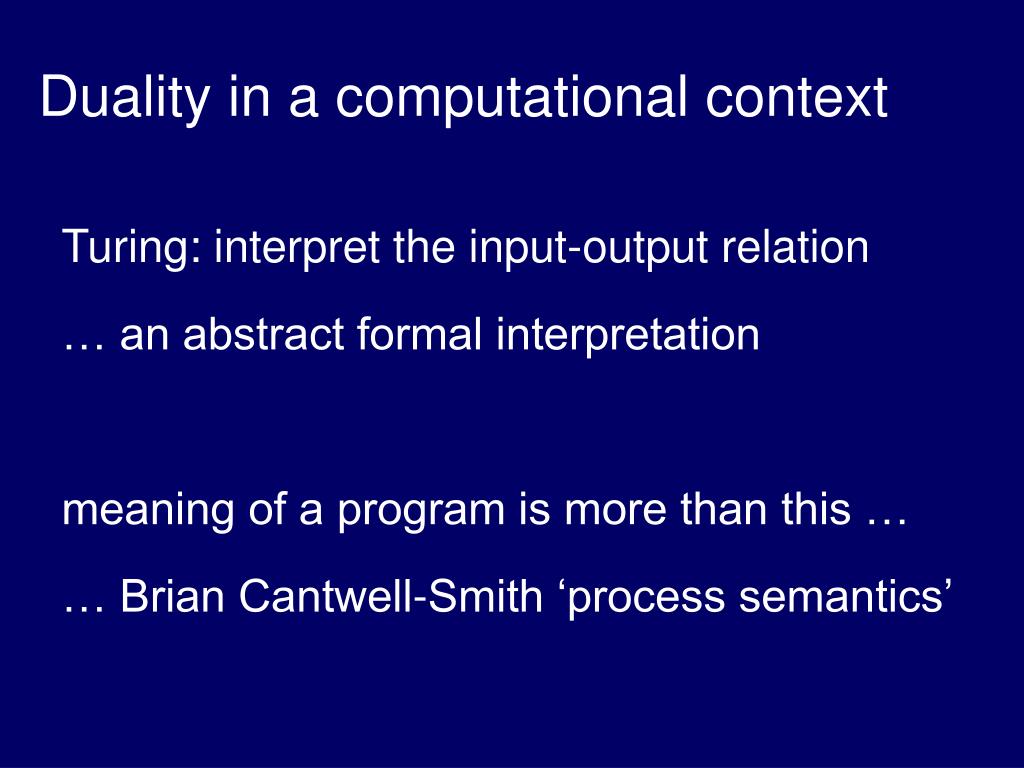 Duality in a computational context • Turing: interpret the input-output relation • … an abstract formal interpretation • meaning of a program is more than this … • … Brian Cantwell-Smith ‘process semantics’