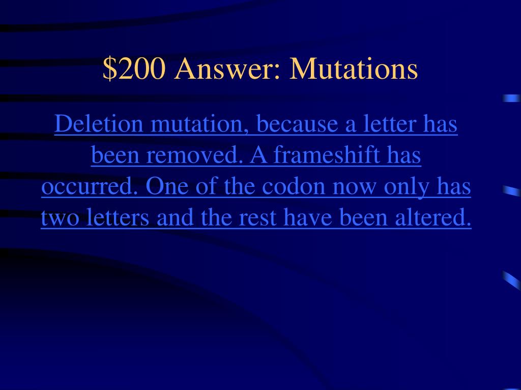$200 Answer: Mutations Deletion mutation, because a letter has been removed. A frameshift has occurred. One of the codon now only has two letters and the rest have been altered.