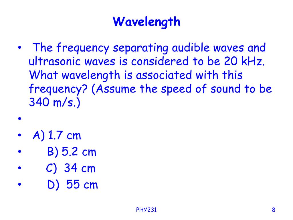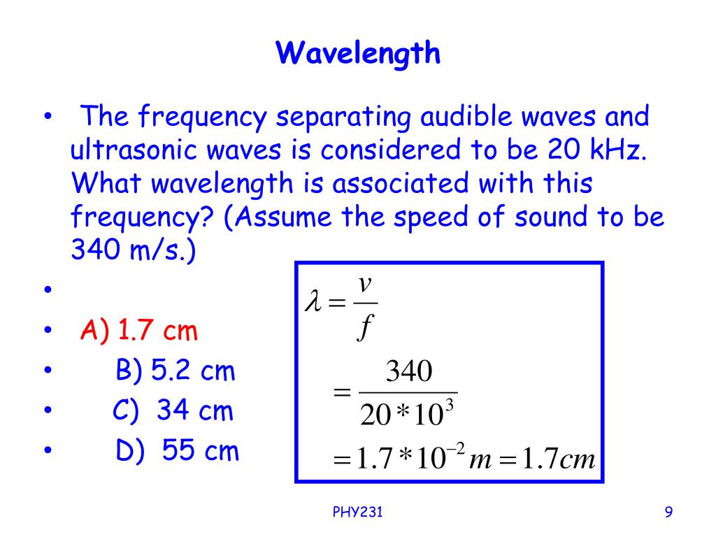 Wavelength • The frequency separating audible waves and ultrasonic waves is considered to be 20 kHz. What wavelength is associated with this frequency? (Assume the speed of sound to be 340 m/s.) • A) 1.7 cm • B) 5.2 cm • C) 34 cm • D) 55 cm PHY231