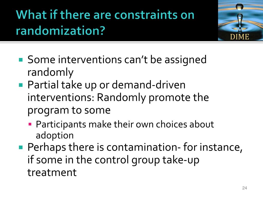 What if there are constraints on randomization? • Some interventions can’t be assigned randomly • Partial take up or demand-driven interventions: Randomly promote the program to some • Participants make their own choices about adoption • Perhaps there is contamination- for instance, if some in the control group take-up treatment 24