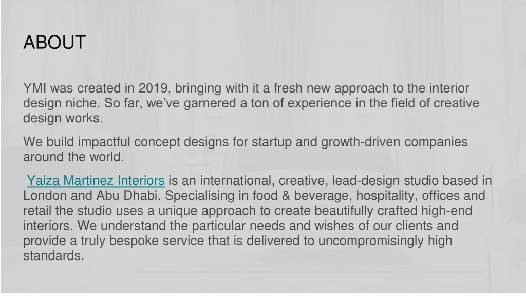 ABOUT YMI was created in 2019, bringing with it a fresh new approach to the interior design niche. So far, we’ve garnered a ton of experience in the field of creative design works. We build impactful concept designs for startup and growth-driven companies around the world. Yaiza Martinez Interiors is an international, creative, lead-design studio based in London and Abu Dhabi. Specialising in food & beverage, hospitality, offices and retail the studio uses a unique approach to create beautifully crafted high-end interiors. We understand the particular needs and wishes of our clients and provide a truly bespoke service that is delivered to uncompromisingly high standards.