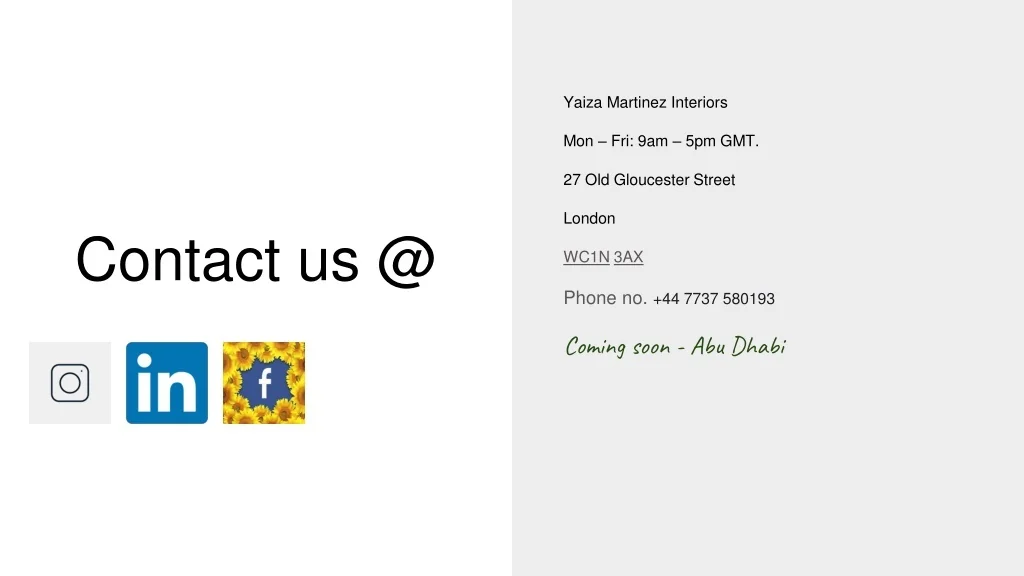 Yaiza Martinez Interiors Mon – Fri: 9am – 5pm GMT. 27 Old Gloucester Street London WC1N3AX Phone no. +44 7737 580193 Coming soon - Abu Dhabi Contact us @