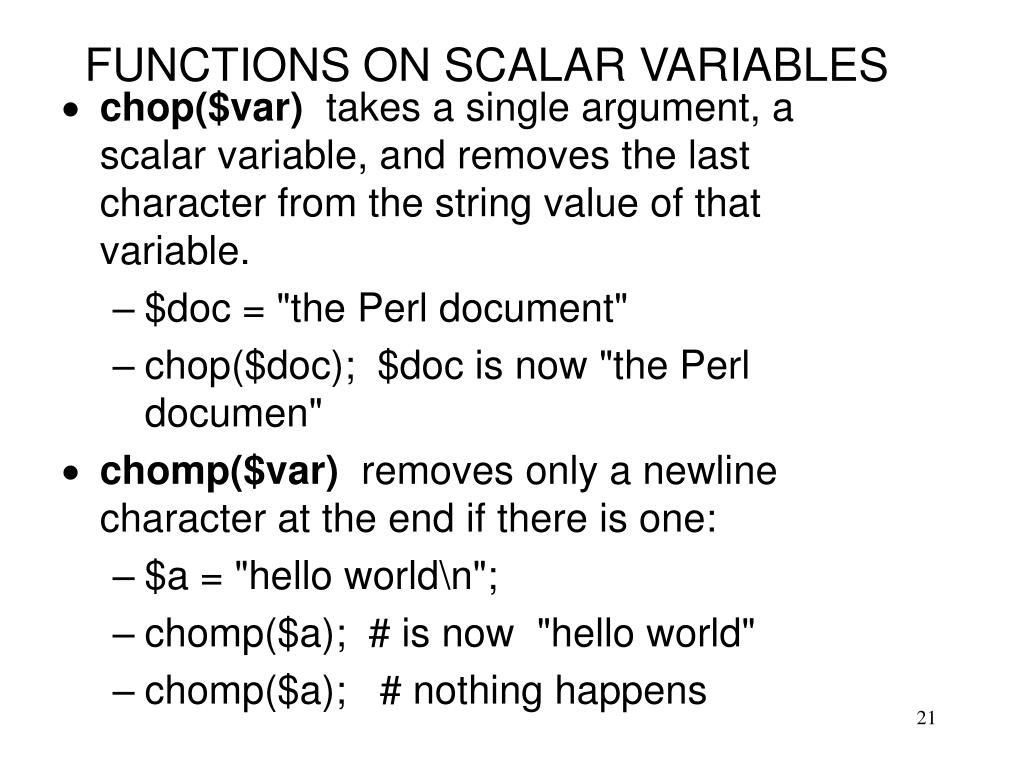 FUNCTIONS ON SCALAR VARIABLES • chop($var) takes a single argument, a scalar variable, and removes the last character from the string value of that variable. • $doc = "the Perl document" • chop($doc); $doc is now "the Perl documen" • chomp($var) removes only a newline character at the end if there is one: • $a = "hello world\n"; • chomp($a); # is now "hello world" • chomp($a); # nothing happens