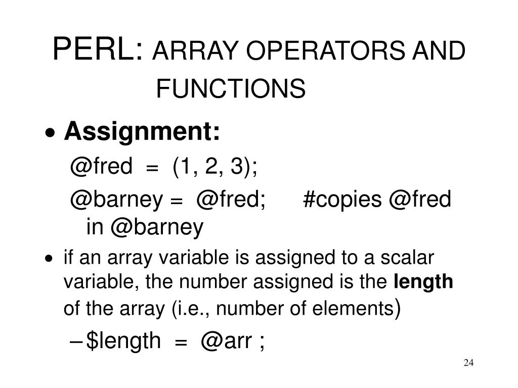 PERL: ARRAY OPERATORS AND FUNCTIONS • Assignment: @fred = (1, 2, 3); @barney = @fred; #copies @fred in @barney • if an array variable is assigned to a scalar variable, the number assigned is the length of the array (i.e., number of elements) • $length = @arr ;