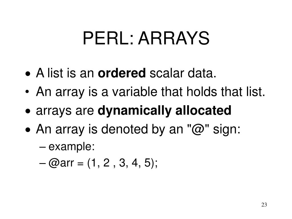 PERL: ARRAYS • A list is an ordered scalar data. • An array is a variable that holds that list. • arrays are dynamically allocated • An array is denoted by an "@" sign: • example: • @arr = (1, 2 , 3, 4, 5);