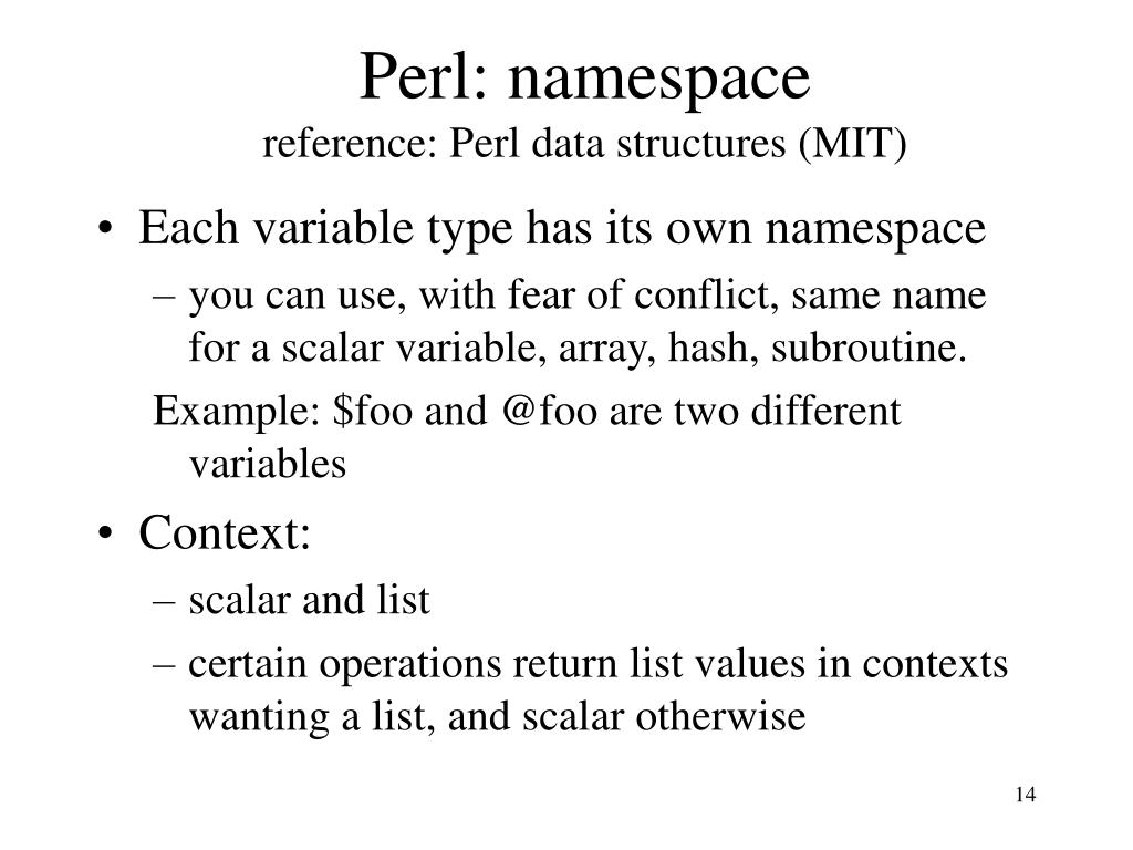 Perl: namespace reference: Perl data structures (MIT) • Each variable type has its own namespace • you can use, with fear of conflict, same name for a scalar variable, array, hash, subroutine. Example: $foo and @foo are two different variables • Context: • scalar and list • certain operations return list values in contexts wanting a list, and scalar otherwise