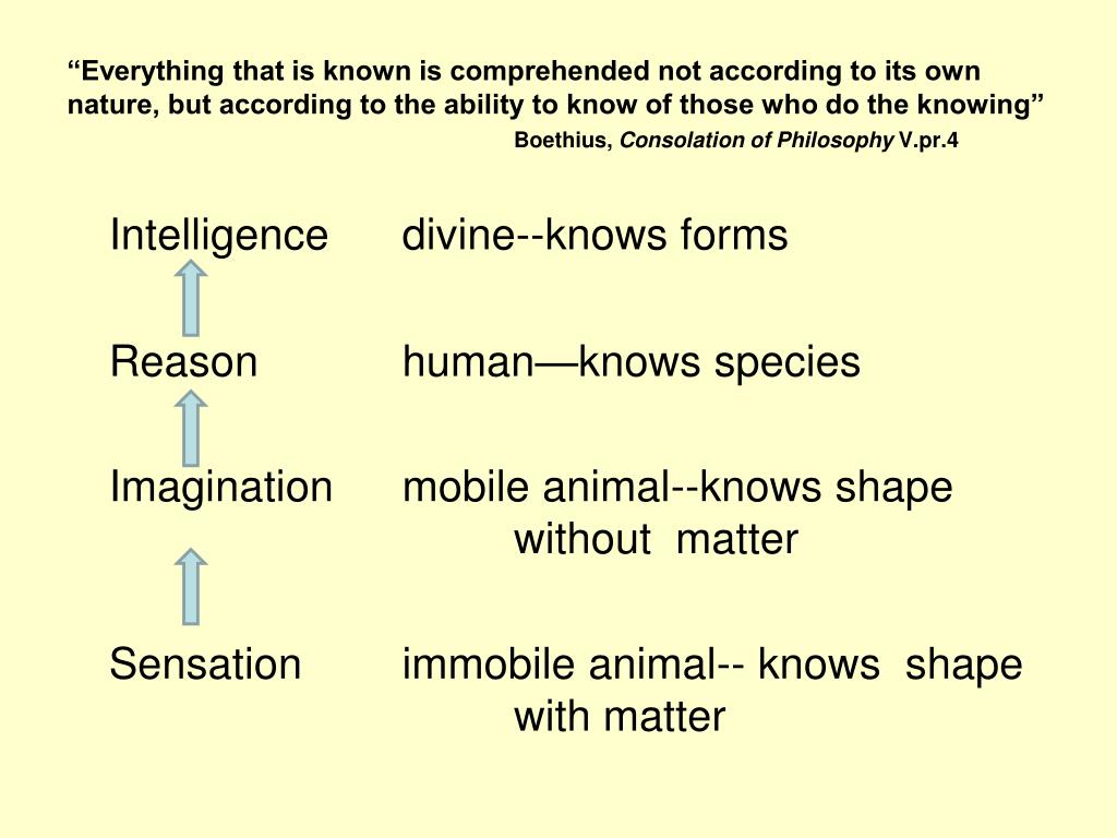 “Everything that is known is comprehended not according to its own nature, but according to the ability to know of those who do the knowing”Boethius, Consolation of Philosophy V.pr.4 Intelligence divine--knows forms Reason human—knows species Imagination mobile animal--knows shape without matter Sensation immobile animal-- knows shape with matter
