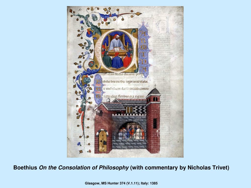 Boethius On the Consolation of Philosophy (with commentary by Nicholas Trivet)Glasgow, MS Hunter 374 (V.1.11); Italy: 1385