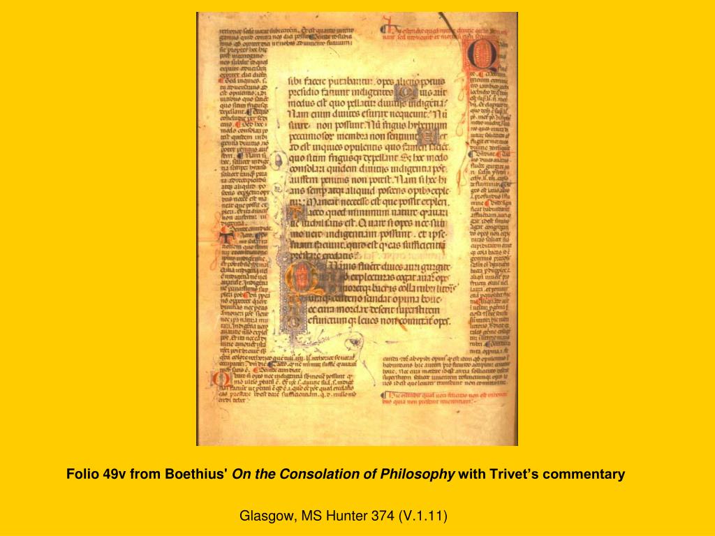 Folio 49v from Boethius' On the Consolation of Philosophy with Trivet’s commentaryGlasgow, MS Hunter 374 (V.1.11)
