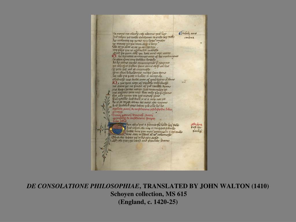 DE CONSOLATIONE PHILOSOPHIAE, TRANSLATED BY JOHN WALTON (1410)Schoyen collection, MS 615(England, c. 1420-25)